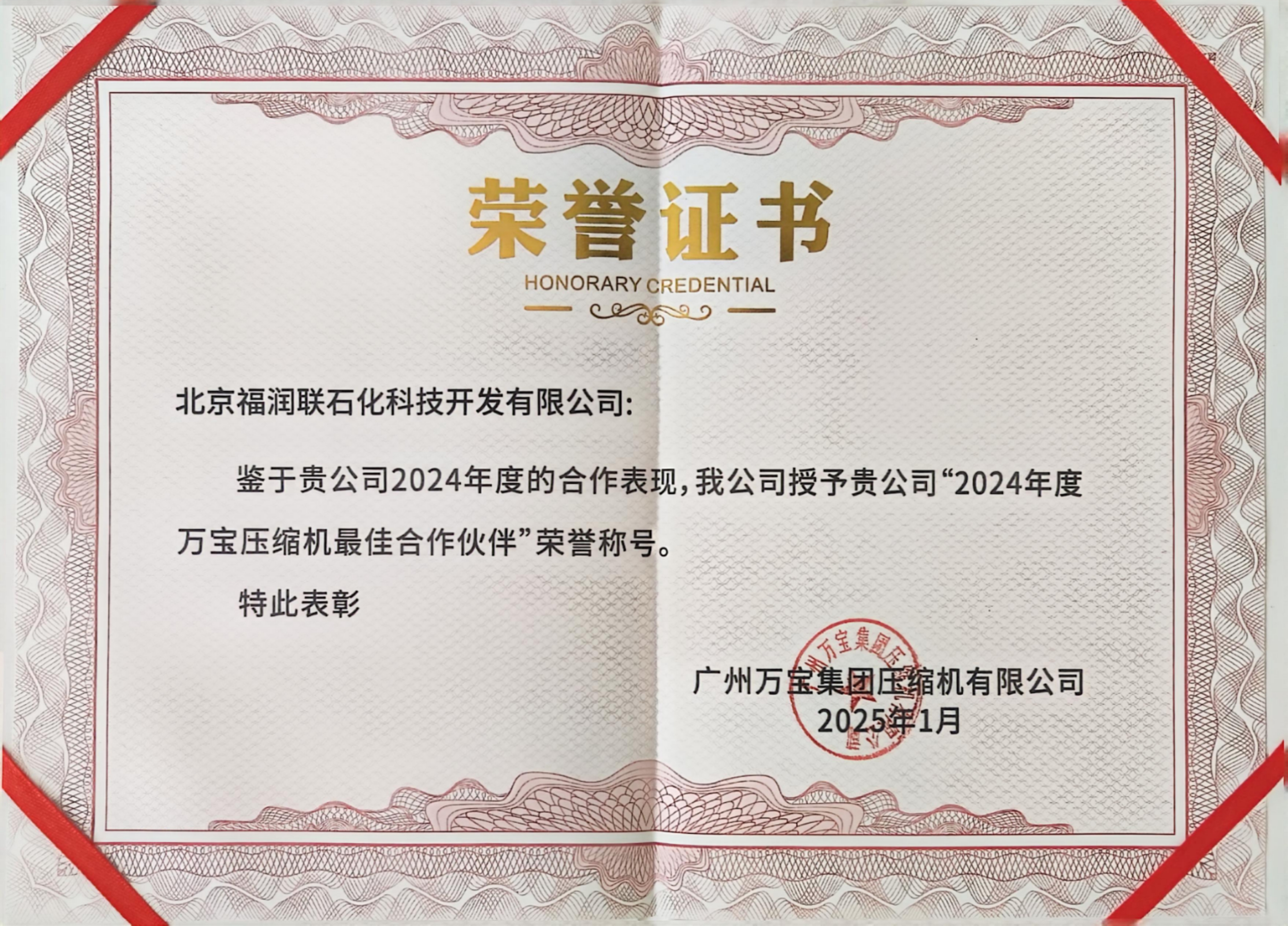 本月在萬寶壓縮機2024年度供應商大會上,北京福潤聯(lián)長期以來強調(diào)建立和維護長期穩(wěn)定的合作關系,構(gòu)建互信、互助、互利的合作機制,促進雙方的共同發(fā)展,榮獲“萬寶壓縮機2024年度******合作伙伴”的榮譽稱號。