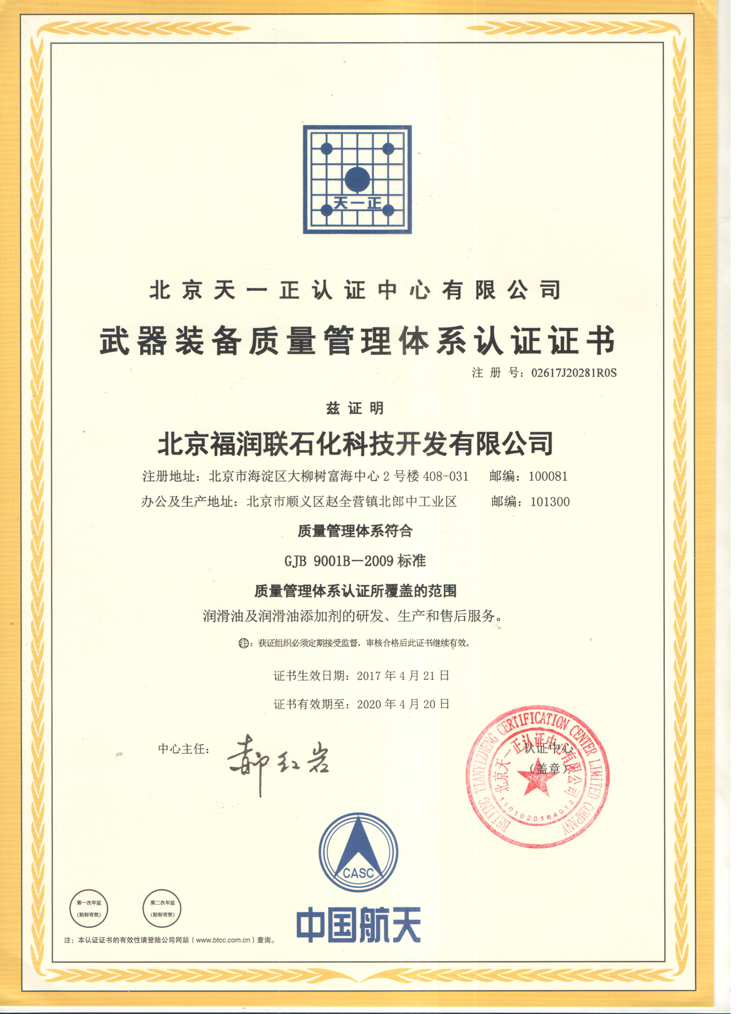 ?2017年4月21日我司通過GJB 9001B-2009標準武器裝備質量管理體系認證,認證范圍:潤滑油及潤滑油添加劑的研發、生產和售后服務;證書注冊號:02617J20281R0S,發證機構:北京天一正認證中心有限公司。
